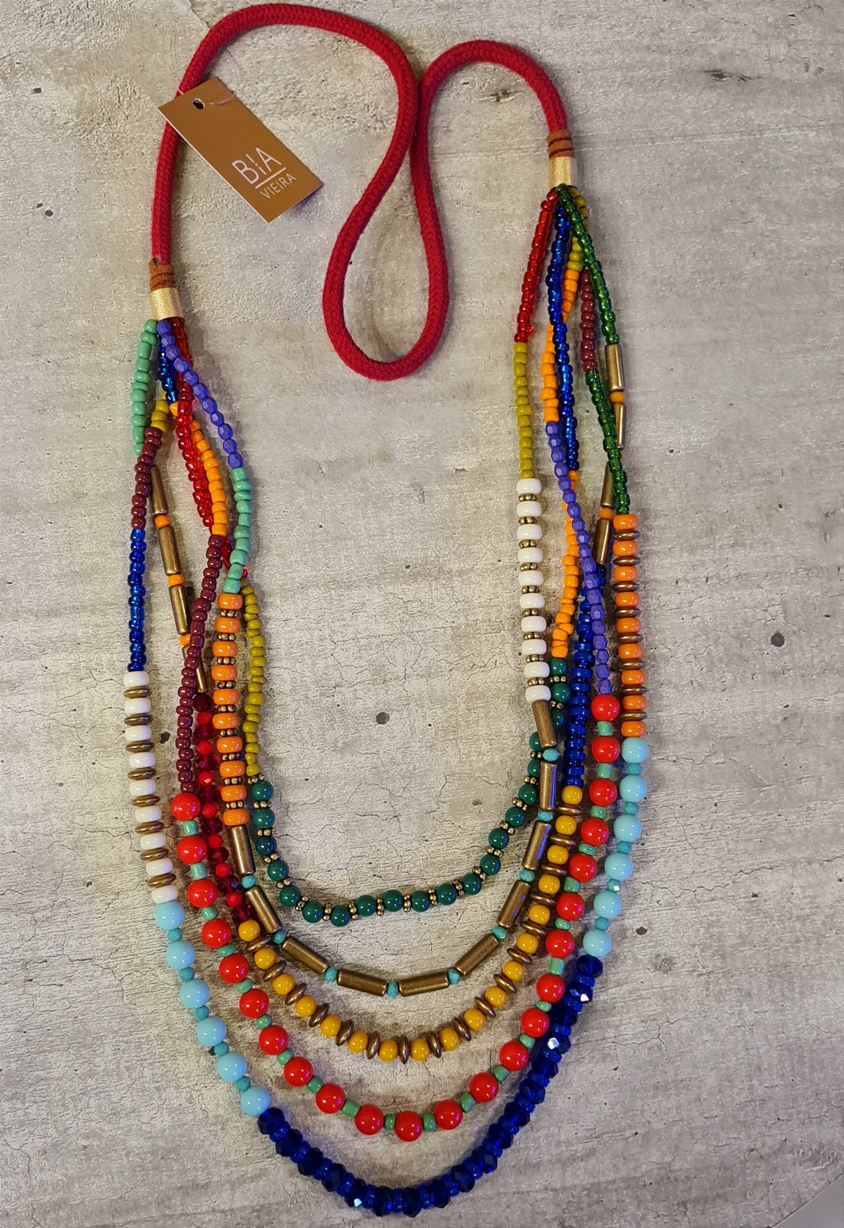 Colar comprido, antialérgico, não contém metal. Com mistura de materias, resina, miçangas, cristais, fios diversos.
